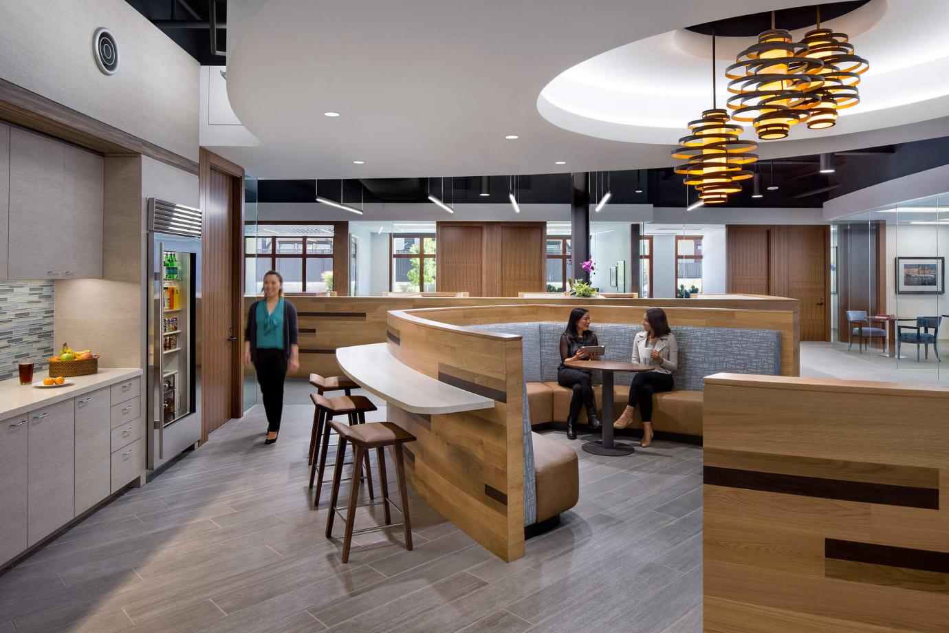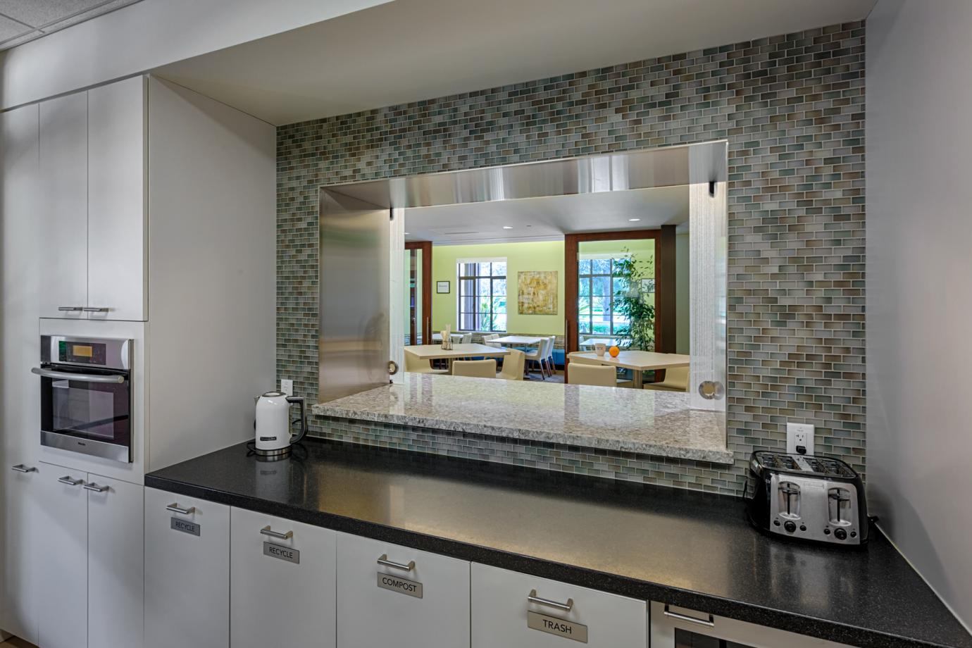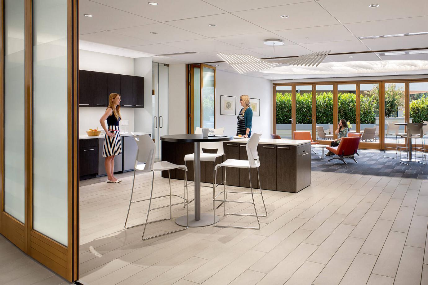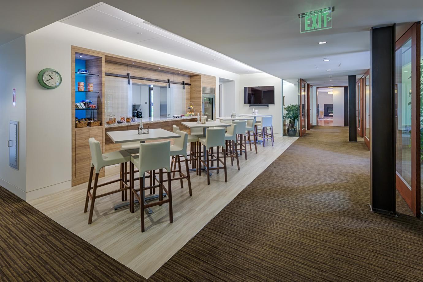 - At a Private Equity firm the food space became a sparkling side destination on the way to the boardroom. Pre meetings and post meeting discussions are extended and boardroom meals can be quietly laid out in this adjacent space. Meetings are supported by food but not interrupted by food service.