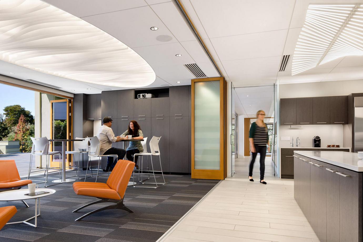 - A venture firm wanted both scenarios: the typical private staff area AND an open and guest friendly food hangout but lacked space for both. Here a series of sliding doors and moving islands allows the space to serve just the staff or expand for annual investor and entrepreneur events even including the exterior deck and garden.
