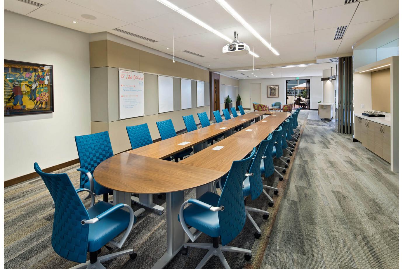- The Skoll Foundation elected to “break out of the box”, the old staff room was demolished, the food space moved across from the boardroom but here the boardroom itself uses a folding wall so that it can become an extension of the food area. Here the food usurps the boardroom! The new food space was also strategically placed to include access to an outdoor terrace.