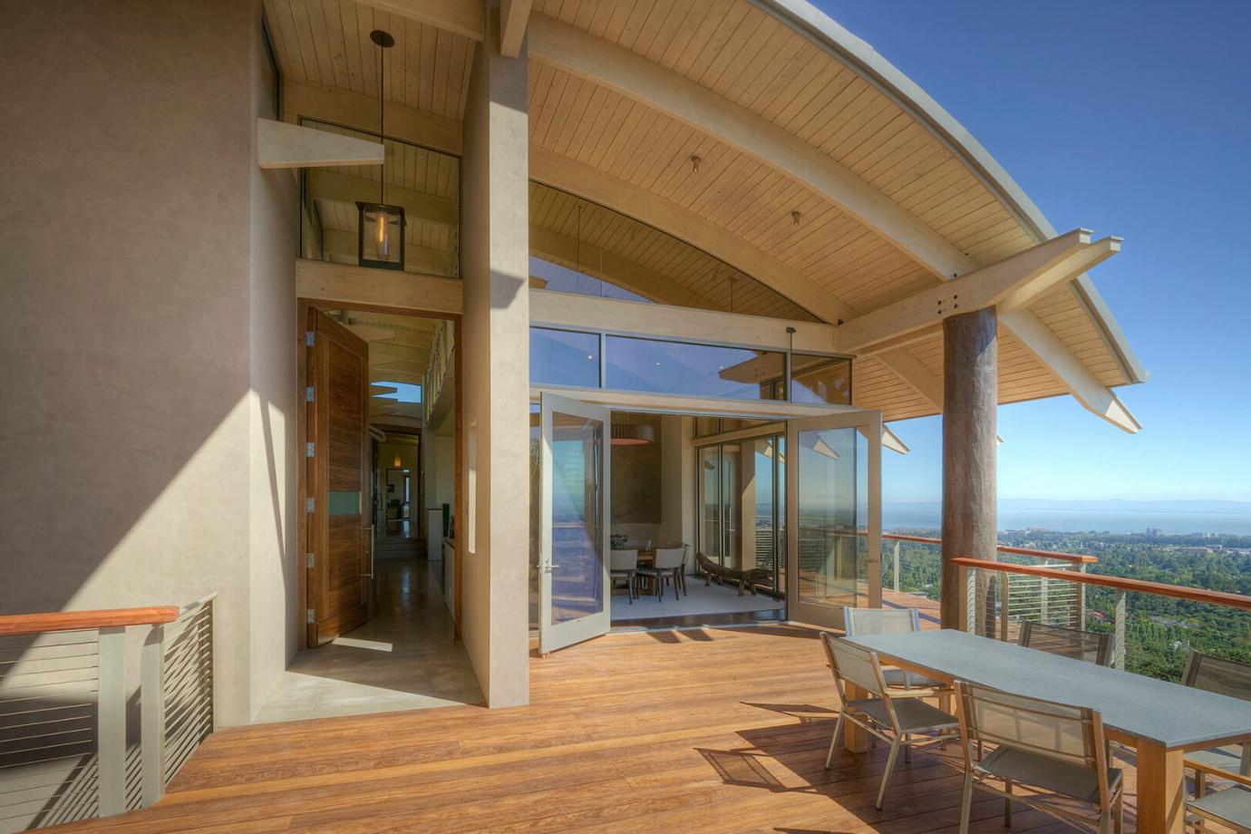 Distant Mount Diablo invites guests to come aboard this 6,000 s.f. hillside house via a wooden bridge leading to an outdoor living ‘room’ which hovers above the heavily wooded site. A transverse beam then leads them to the front door where a 42’ long truss leads to the living room with views of San Francisco beyond.
